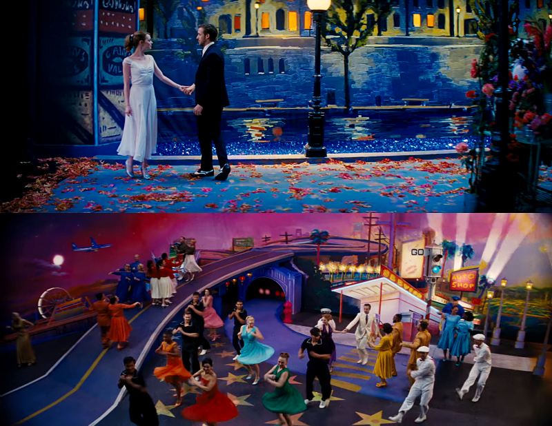 라라랜드는 영화 스토리텔링의 필수 요소인 기억에 남는 음악과 멋진 안무로 유명합니다. 이 영화의 사운드 트랙은 저스틴 후르비츠가 작곡한 오리지널 곡들과 벤저민 파섹과 저스틴 폴이 작사한 곡들이 특징입니다. 이 음악은 전통적인 브로드웨이 스타일의 쇼를 보여주는 곡조와 현대 팝 및 재즈의 영향을 혼합하여 독특하고 잊을 수 없는 사운드를 만들어내고 있습니다. 맨디 무어가 만든 이 안무는 고전 할리우드 뮤지컬에 착안한 정교한 댄스로 음악에 활기를 불어넣는 동시에 현대적 스타일도 접목시켰습니다. 눈에 띄는 뮤지컬 장면 중 하나는 라라랜드는 이런 영화입니다! 하고 보여주는 오프닝 장면입니다. "Another Day of Sun", 로스앤젤레스 고속도로에서 대규모 댄스 시퀀스를 특징으로 하고 있습니다. 또한 듀엣곡 "City of Stars"도 팬들 사이에서 늘 이야기되는 곡으로 엠마스톤과 라이언 고슬링이 도시에서 노래하고 춤추는 모습을 보여주고 있습니다.